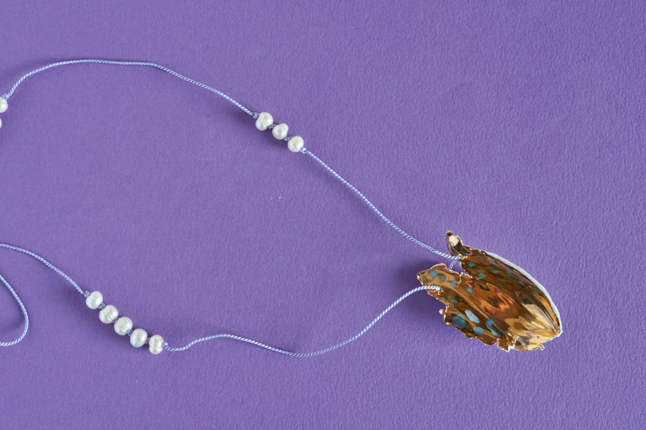 materiál - porcelán, pokoveno 12%roztokem zlata, hedvábná šňůrka, říční perly